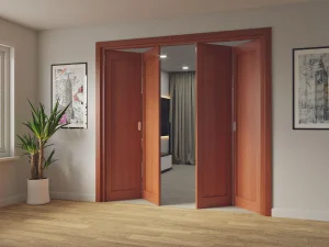 Pintu lipat terdiri dari beberapa panel yang dapat dilipat dan digeser ke satu sisi. Desain ini sangat efisien dalam menghemat ruang dan membuat ruangan terasa lebih terbuka.